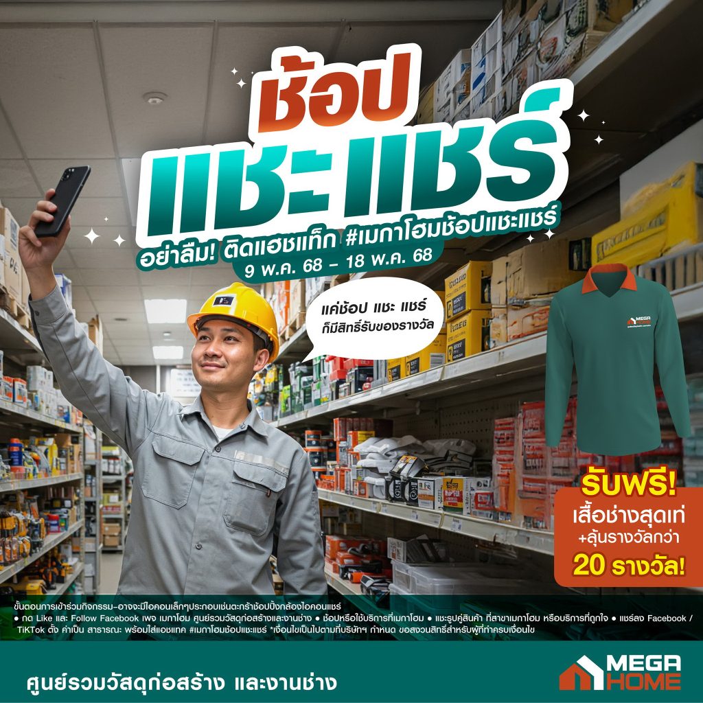 ครั้งแรกในไทย !! เปิดจุดหมายใหม่ อีเว้นต์ที่รวมทุกเรื่องบ้านและงานช่างไว้ในที่เดียว อัดแน่นความคุ้มค่า ความสนุก และความยิ่งใหญ่เกินใคร “เมกาโฮม เมกาแฟร์” งานเดียวที่รวมช่างมืออาชีพ และเจ้าของบ้านมาเจอกัน พร้อมกิจกรรมพิเศษที่หาจากไหนไม่ได้! มางานนี้ #ช่างมาได้งาน #เจ้าของบ้านมาได้ช่าง เสิร์ฟหลากหลายสิทธิประโยชน์ตลอด 10 วันเต็ม! 9-18 พฤษภาคม 2568 นี้ ช้อปสินค้าราคาลดกระหน่ำทั้งเรื่องบ้านและงานช่าง สูงสุด 50% !! แจกไม่พักตลอดงาน รับฟรี! คูปองส่วนลด มูลค่าสูงสุดกว่า 1,200 บาท พิเศษ! สำหรับสมาชิกช่างใหม่ สมัครในงานรับทันทีส่วนลดเข้าวอลเล็ต 250 บาท! และอย่าพลาด! กับกิจกรรมเอาใจทีมช่าง ง่ายๆ เพียง ช้อป-แชะ-แชร์ พร้อมติดแฮชแท็ก #เมกาโฮมช้อปแชะแชร์ บนโซเชียล ก็ลุ้นรับของรางวัลสุดเท่ของช่างตัวจริงได้เลย !!