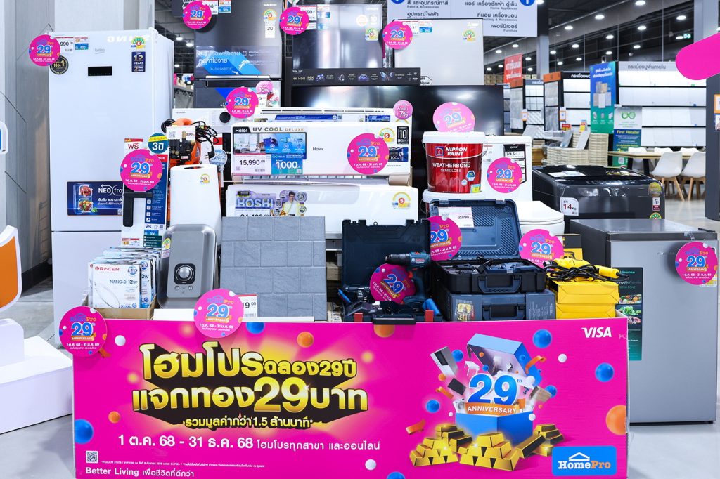 ตลอด 29 ปีที่ผ่านมา โฮมโปร เติบโตเคียงข้างบ้านของคนไทยในฐานะ “ผู้นำโซลูชันเรื่องบ้านครบวงจร” ที่เข้าใจทั้งความคุ้มค่าและความสุขการอยู่อาศัย ในโอกาสครบรอบ 29 ปี นับเป็นอีกก้าวสำคัญของการเดินทาง โฮมโปรจึงขอ “ขอบคุณ” และ “คืนกำไร” ให้ลูกค้าอย่างรู้ใจ ผ่านแคมเปญใหญ่ปลายปี “HomePro 29th Anniversary” พร้อมต่อยอดความสำเร็จของ “เมกาโฮม ครบรอบ 12 ปี” ด้วยกิจกรรมพิเศษ “แจกทอง 29 บาท” !! รวมมูลค่ากว่า 1.5 ล้านบาท (ราคาทอง ณ วันที่ 9 กันยายน 2568) พร้อมมอบดีลสุดคุ้มให้เลือกได้ตามสไตล์ ไม่ว่าจะเป็นส่วนลดทันที คะแนนสะสม เงินคืน สิทธิแลกซื้อ และอื่นๆ อีกมากมาย ตั้งแต่ 1–11 พ.ย. 68 ที่โฮมโปร เมกาโฮมทุกสาขาทั่วประเทศ และออนไลน์