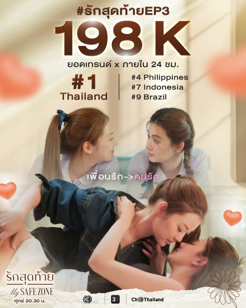 ทำเอาแฮชแท็ก #รักสุดท้ายEP3 พุ่งทะยานขึ้นติด อันดับ 1 เทรนด์ X ประเทศไทย พร้อมเสียงชื่นชมล้นหลามจากแฟน ๆ ทั่วเอเชียในขณะที่คีย์เวิร์ด LENAMIU MY SAFE ZONE EP3 ติด Worldwide อันดับ 10 และประเทศไทย อันดับ 3 สร้างสถิติ New High ทั้งในประเทศและระดับโลก นับเป็นการตอกย้ำความแรงของซีรีส์แซฟฟิกที่แฟน ๆ ให้ความสนใจอย่างล้นหลามและพูดถึงโมเมนต์ของสองนักแสดงนำ “ลีน่า–หมิว”