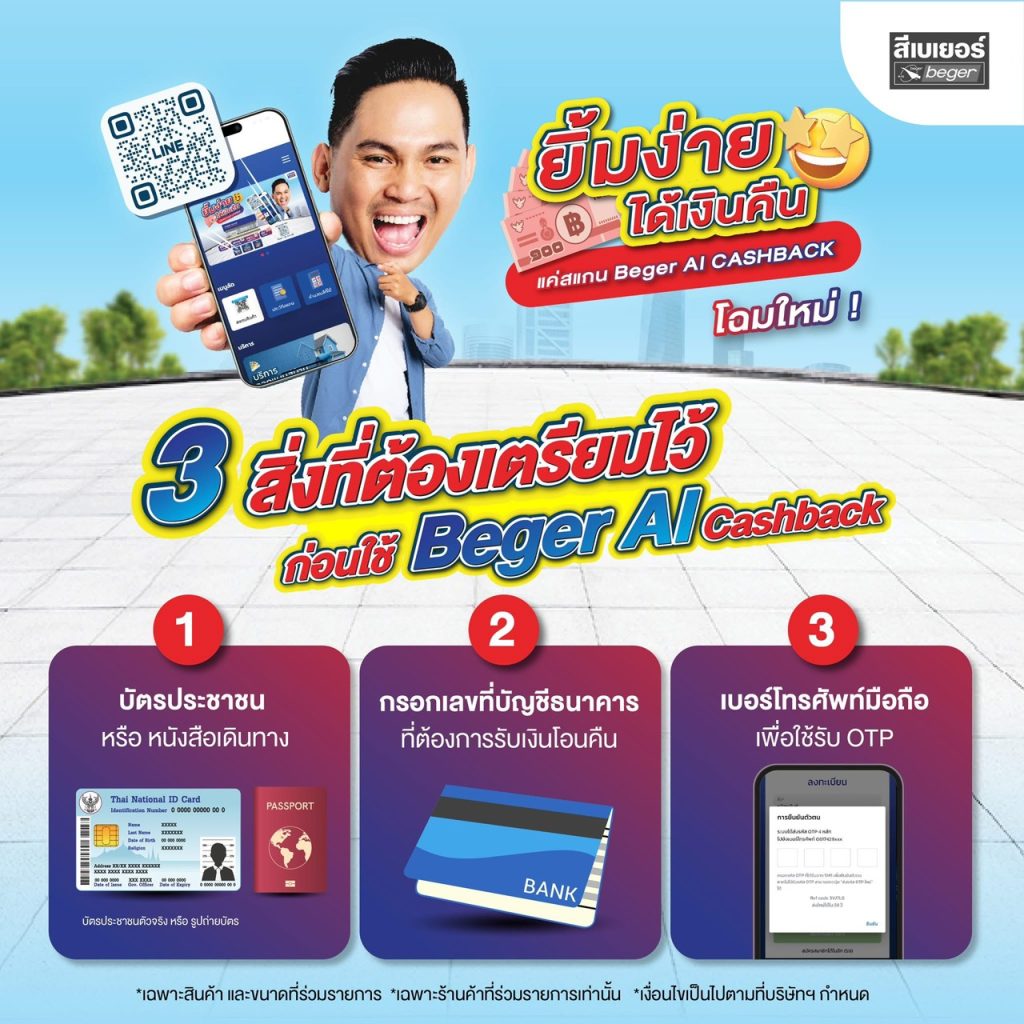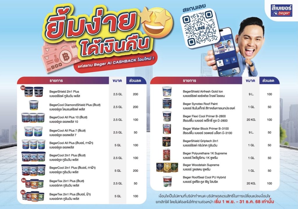 เบเยอร์มุ่งมั่นพัฒนานวัตกรรมเพื่อให้ทั้งผู้ซื้อและคู่ค้าได้รับประโยชน์สูงสุด ลดปัญหาเอกสารและความล่าช้าของระบบ พร้อมสร้างโอกาสและเครื่องมือให้ร้านค้าไทยสามารถแข่งขันและเติบโตได้อย่างมั่นคงในยุคดิจิทัลติดตามข้อมูลเพิ่มเติมรายละเอียดเกี่ยวกับผลิตภัณฑ์สีเขียวและโครงการความร่วมมือต่างๆสามารถติดตามข้อมูลเพิ่มเติมได้ที่:https://landing.beger.co.th/beger-ai-v2-cashback/