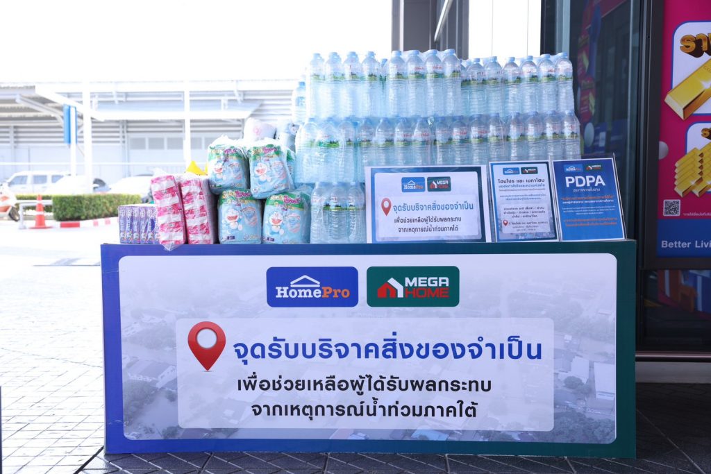 โฮมโปรและเมกาโฮม จะเปิดจุดรับบริจาคสิ่งของจำเป็นที่ โฮมโปรและเมกาโฮม ทุกสาขาทั่วประเทศ โดยตั้งจุดรับบริจาคหลักที่บริเวณพื้นที่หน้าสาขา ตั้งแต่เวลา 09.00 น. เป็นต้นไป เชิญชวนลูกค้าและประชาชนร่วมเป็นส่วนหนึ่งในการส่งต่อกำลังใจ ผ่านการบริจาคสิ่งของที่จำเป็นต่อการดำเนินชีวิตในช่วงวิกฤต อาทิ อาหารพร้อมทานหรืออาหารกระป๋อง บะหมี่กึ่งสำเร็จรูป ข้าวสาร อาหารแห้ง น้ำดื่ม ยารักษาโรค เสื้อผ้า ผ้าห่ม ผ้าเช็ดตัว เป็นต้น สิ่งของทั้งหมดนี้ จะถูกรวบรวมและจัดส่งไปยังพื้นที่ประสบอุทกภัยในภาคใต้ เพื่อให้ถึงมือผู้ที่ต้องการความช่วยเหลือโดยเร็วที่สุด