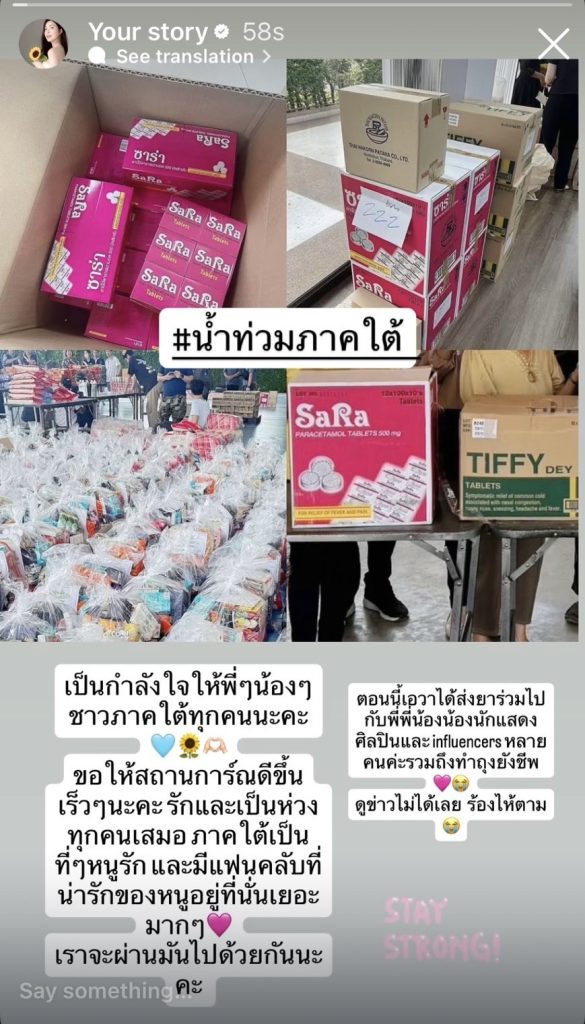 ไม่ใช่แค่คำพูด แต่เอวายังลงมือทำทันที โดยร่วม ส่งยาและของจำเป็น ไปช่วยผู้ประสบภัย พร้อมศิลปิน–นักแสดง–อินฟลูเอนเซอร์หลายคน แถมยังจัด ถุงยังชีพ ใส่ของจำเป็นเพื่อกระจายไปยังพื้นที่ประสบภัยอีกด้วย เรียกได้ว่าใจสวยไม่แพ้หน้าตาเลยทีเดียว