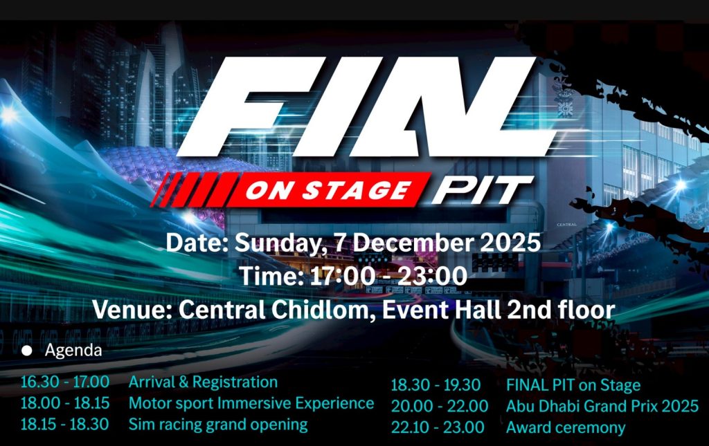 ไฮไลท์สุดพิเศษแห่งปีจาก “FINAL PIT ON STAGE AT CENTRAL CHIDLOM PRESENTED BY THONBURI PHANICH” ณ Event Hall ชั้น 2 ห้างเซ็นทรัลชิดลม จะเป็นการรวมพลังของโลก Motorsport x Lifestyle อย่างเต็มรูปแบบ รวมถึงการจัดแสดงไอเท็มของนักแข่งระดับตำนานที่เคยใช้ในสนามแข่งจริง กิจกรรมพิเศษที่เปิดโอกาสให้แฟนรายการ Final Pit ได้ใกล้ชิดกับอองตวน ปินโต ในรูปแบบที่ไม่เคยเกิดขึ้นมาก่อน และกิจกรรมสุดเอ็กซ์คลูซีฟอีกมากมาย ได้แก่