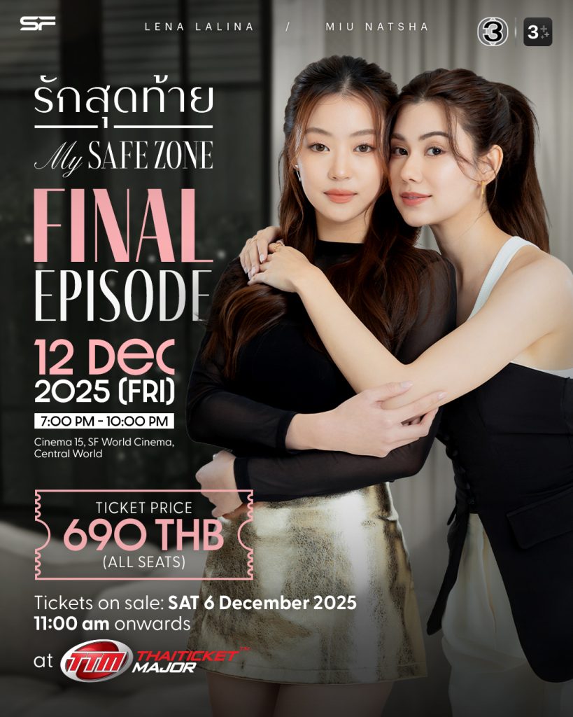 งานนี้ไม่ธรรมดา เพราะคุณจะได้ดูตอนจบอย่างใกล้ชิดกับสองสาว ลีน่า-หมิว ที่จะมาร่วมแชร์โมเมนต์สุดพิเศษและพูดคุยถึงเบื้องหลังความประทับใจส่งท้ายซีรีส์ด้วยตัวเอง ใครที่อยากรู้ว่าเซฟโซนของอลินและเจนจะลงเอยอย่างไร เตรียมตัวเตรียมใจให้พร้อมแล้วมาร่วมลุ้นบทสรุปไปพร้อมกัน พร้อมเปิดจำหน่ายบัตรในวันเสาร์ที่ 6 ธันวาคม 2568 เวลา 11.00 น. เป็นต้นไป ราคาบัตร 690 บาท (ทุกที่นั่ง) ทาง www.thaiticketmajor.com