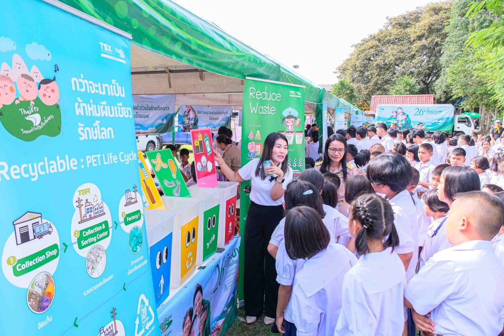 กิจกรรมที่ได้รับความสนใจจากน้อง ๆ นักเรียนเป็นพิเศษ คือ การเรียนรู้ขั้นตอนการผลิตผ้าห่มผืนเขียวรักษ์โลก ผ่านบูทนิทรรศการที่ถ่ายทอดขั้นตอนการแปลงขวด PET เป็นผ้าห่มผืนเขียวรักษ์โลก ตั้งแต่การเก็บรวบรวม คัดแยก ล้าง บด และผลิตเป็นเม็ดพลาสติก ก่อนนำไปปั่นเป็นเส้นใย rPET และเข้าสู่กระบวนการทอเป็นผ้าห่มผืนเขียวรักษ์โลกที่ยังคงคุณภาพให้มีความนุ่มและอบอุ่น ด้วยนวัตกรรม Eco Friendly Blanket โครงการไทยเบฟ…รวมใจต้านภัยหนาว ได้ส่งมอบผ้าห่มผืนเขียวรักษ์โลกปีละ 200,000 ผืน ซึ่งผลิตจากการ                  รีไซเคิลขวด PET ได้ถึงปีละ 7.6 ล้านขวด จนปัจจุบันได้เพิ่มมูลค่าให้ขวด PET และส่งต่อประโยชน์ต่อสังคม แล้วกว่า 45.6 ล้านขวด ส่งมอบเป็นผ้าห่มผืนเขียวรักษ์โลก 1,200,000 ผืน ซึ่งผ้าห่มหนึ่งผืนเทียบเท่าการ                  รีไซเคิลขวด PET 38 ขวด