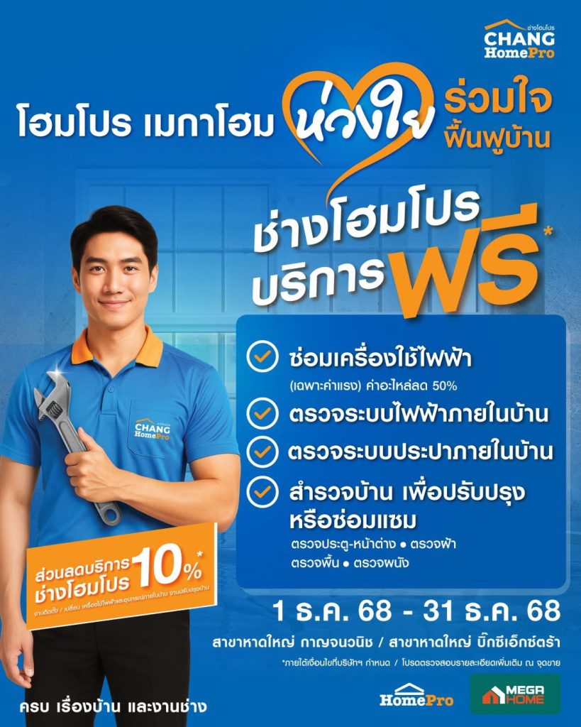 จากสถานการณ์น้ำท่วมในหลายพื้นที่ภาคใต้เริ่มคลี่คลายลง โฮมโปร และเมกาโฮม เดินหน้าภารกิจฟื้นฟูบ้านเรือนและคุณภาพชีวิตของพี่น้องชาวใต้ ผ่านโครงการ “โฮมโปร เมกาโฮม ห่วงใย ร่วมใจฟื้นฟูบ้าน” โดยระดมทีม CHANG HomePro (ช่างโฮมโปร) มืออาชีพ ลงพื้นที่จริงตรวจเช็คระบบไฟฟ้า–ประปา-ซ่อมเครื่องใช้ไฟฟ้า ฟรี!-สำรวจบ้านเพื่อปรับปรุงหรือซ่อมแซม พร้อมมอบส่วนลดพิเศษ เพื่อช่วยบรรเทาภาระค่าใช้จ่ายในการฟื้นฟูบ้านเรือน ให้ครอบครัวที่ได้รับผลกระทบจากน้ำท่วม พร้อมชวนคนไทยทุกคนทั่วประเทศ ร่วม“ส่งต่อกำลังใจ จากคนไทยสู่ภาคใต้” ผ่านการซื้อของจำเป็นเพื่อบริจาคให้ผู้ประสบภัยภาคใต้ผ่านโฮมโปร ออนไลน์ และร่วมเป็นอีกแรงในการฟื้นฟูบ้านเรือนให้กลับมาปลอดภัยและน่าอยู่ได้อีกครั้ง
