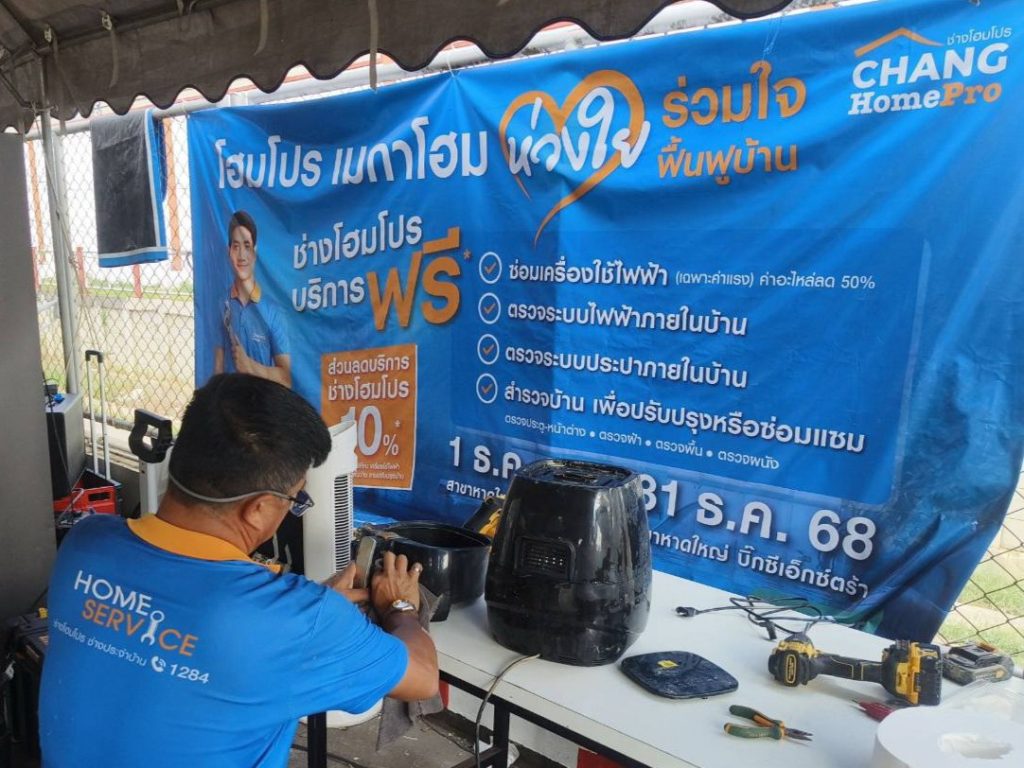 เพื่อให้ทุกครอบครัวในพื้นที่ประสบภัยกลับมาใช้ชีวิตประจำวันได้อย่างปลอดภัยและปกติโดยเร็วที่สุด โฮมโปรและเมกาโฮม ได้เปิดพื้นที่หน้าสาขา โฮมโปร หาดใหญ่ (กาญจนวนิช) และ โฮมโปร หาดใหญ่ บิ๊กซีเอ็กซ์ตร้า เป็นจุดบริการช่วยเหลือด้านเครื่องใช้ไฟฟ้าและระบบไฟฟ้าภายในบ้านให้กับชุมชนในพื้นที่หาดใหญ่และจังหวัดใกล้เคียง โดยทีม CHANG HomePro (ช่างโฮมโปร) ลงพื้นที่ช่วยตรวจเช็คระบบไฟฟ้า-ประปา พร้อมให้บริการซ่อมแซม ในช่วงหลังน้ำลด ผ่านบริการหลากหลายรูปแบบ ไม่ว่าจะเป็น