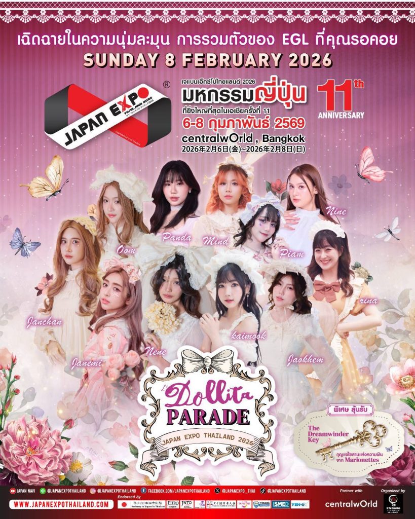 มาร่วมเป็นส่วนหนึ่งของ ขบวนพาเหรดสุดอลังการ “Dollita Parade” ขบวนอันงดงามที่จะทำให้หัวใจของทุกคนเต้นแรงและอบอุ่นไปพร้อมกัน ณ งาน Japan Expo Thailand 2026 นำขบวนโดยเหล่าดอลลิต้าไอดอลภายใต้ธีม “ตุ๊กตาไขลาน” ไข่มุก-วรัทยา ดีสมเลิศ, แจนจัง-เจตสุภา เครือแตง, เจน-กุลจิราณัฐ วรรักษา, อุ้ม-ณัชชา กฤษฎาสิมะ, มายด์-ปณิศา ศรีละเลิง, รินะ-รินะ อิซึตะ, แพนด้า-จิดาภา แช่มช้อย, นาย-ภัทรนรินทร์ เหมือนฤทธิ์, เปี่ยม-รินรดา อินทร์ไธสง, เจ้าเข็ม-ชนิกานต์ บุษดี และ เนเน่-ธนิดา อัครวุฒิ