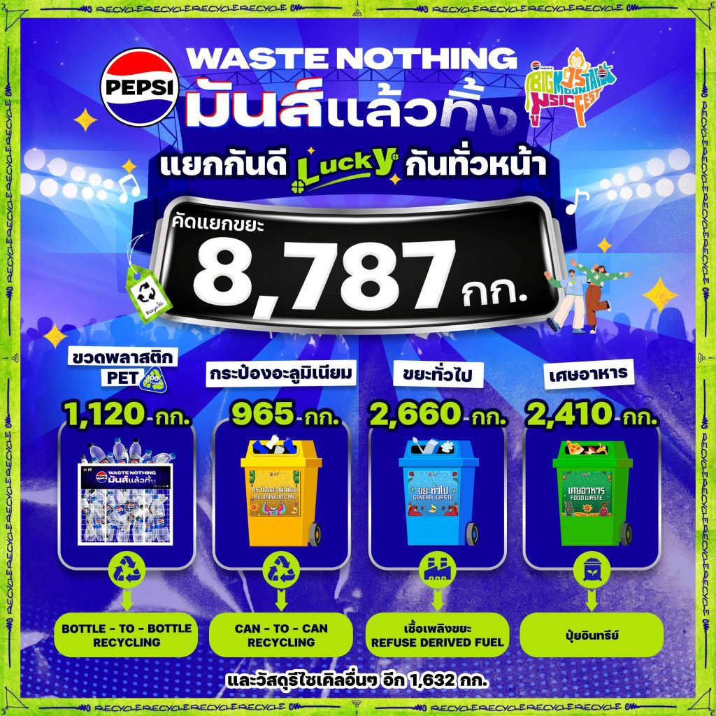 ตลอดสามปีของการดำเนินแคมเปญ “Waste Nothing – มันส์ แล้ว ทิ้ง” ภายในงานเป๊ปซี่ พรีเซนต์ บิ๊กเมาน์เท่นมิวสิคเฟสติวัล ตั้งแต่ ปี 2566 สามารถคัดแยกขยะเพื่อนำเข้าสู่กระบวนการรีไซเคิลและใช้ประโยชน์อย่างเหมาะสมได้สูงถึง 24,972 กิโลกรัม ประกอบด้วย ขวดพลาสติก PET จำนวน 4,400 กิโลกรัม กระป๋องอะลูมิเนียม 3,450 กิโลกรัม ขยะรีไซเคิลอื่น ๆ 2,022 กิโลกรัม ขยะเศษอาหาร 7,200 กิโลกรัม และขยะทั่วไป 7,900 กิโลกรัม