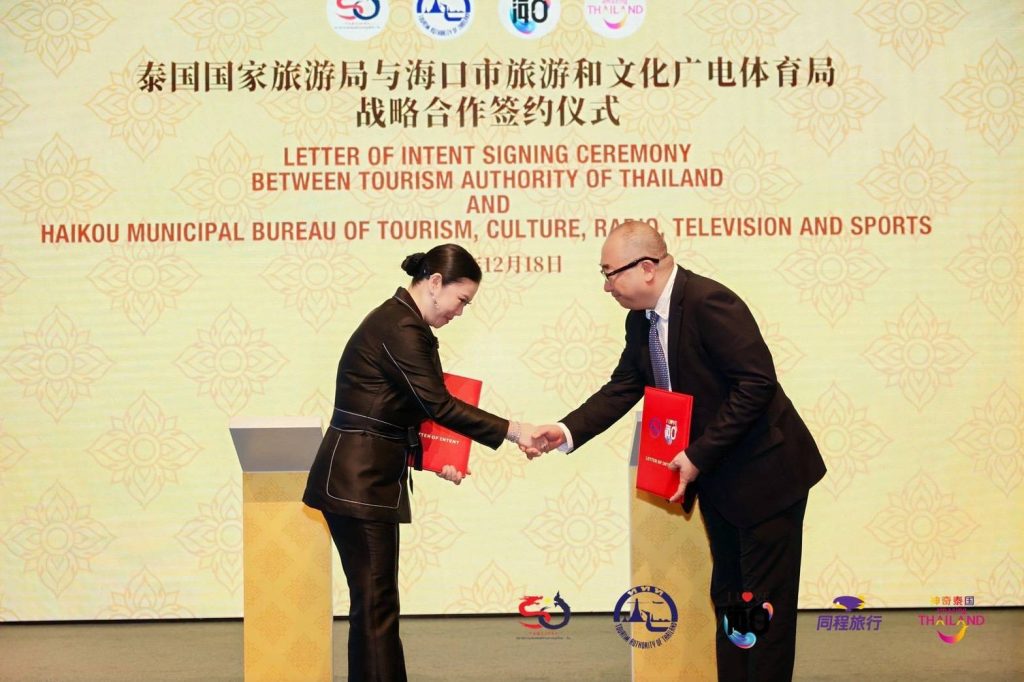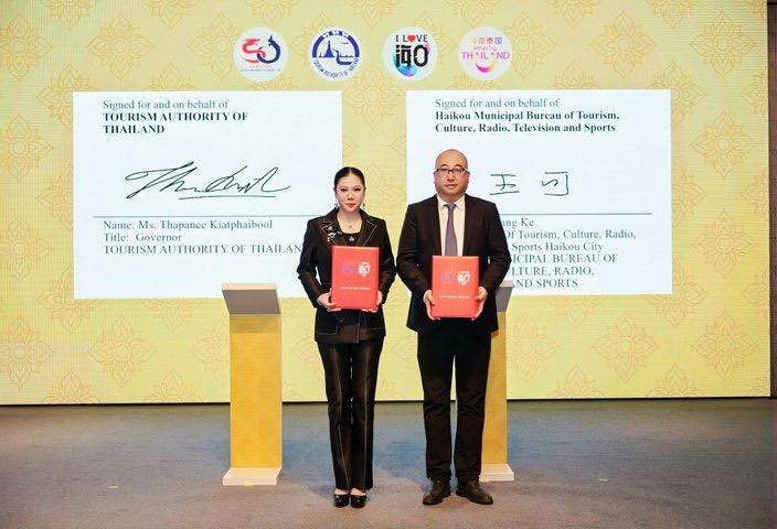 การท่องเที่ยวแห่งประเทศไทย (ททท.) นำโดย นางสาวฐาปนีย์ เกียรติไพบูลย์ ผู้ว่าการการท่องเที่ยวแห่งประเทศไทย (ผทท.) เข้าร่วมในพิธีลงนามข้อตกลงความร่วมมือด้านการท่องเที่ยว Letter of Intent (LOI) กับ สำนักการท่องเที่ยว วัฒนธรรม วิทยุ โทรทัศน์ และกีฬา นครไหโข่ว นำโดย คุณหวัง เค่อ ผู้อำนวยการสำนักการท่องเที่ยวฯ ไหโข่ว และบริษัท Tongcheng Travel นำโดย คุณหลี่ หมิงห้าว รองประธานกลุ่มบริษัท Tongcheng Group ณ นครไหโข่ว มณฑลไห่หนาน สาธารณรัฐประชาชนจีน เพื่อสร้างกรอบความร่วมมือเชิงกลยุทธ์ระยะยาว และยกระดับความสัมพันธ์ด้านการท่องเที่ยวระหว่างไทย-จีน ภายใต้แนวคิด “จงไท่-อี้เจียชิน” หรือ จีนไทย ครอบครัวเดียวกัน