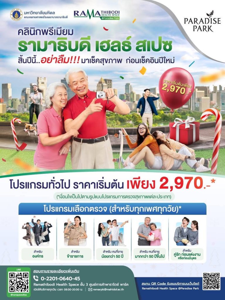 นอกจากการช้อปปิ้งของดีแล้ว การดูแลสุขภาพก็เป็นอีกหนึ่งของขวัญที่สำคัญ พาราไดซ์ พาร์ค ชวนทุกคนมาใส่ใจตัวเองและคนที่คุณรัก กับ โปรแกรมตรวจสุขภาพจาก คลินิกพรีเมียม รามาธิบดี เฮลธ์สเปซ @ พาราไดซ์ พาร์ค