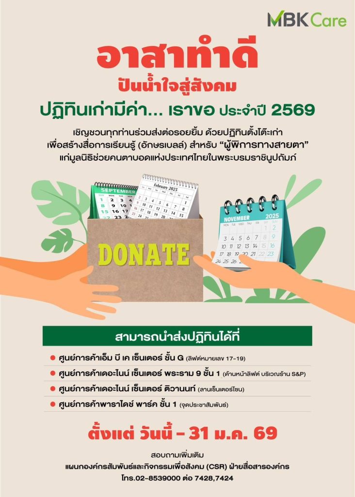 เอ็ม บี เค เซ็นเตอร์ พาราไดซ์ พาร์ค เดอะไนน์ เซ็นเตอร์ พระราม 9 และ เดอะไนน์ เซ็นเตอร์ ติวานนท์ 4 ศูนย์การค้าในเครือเอ็ม บี เค ขอเชิญชวนร่วมบริจาค ปฏิทินตั้งโต๊ะปีเก่า ครั้งที่ 7 ในกิจกรรม ปฏิทินเก่ามีค่า…เราขอ ประจำปี 2569 ภายใต้โครงการ MBK Care อาสาทำดีปันน้ำใจสู่สังคม เพื่อส่งต่อปฏิทินเก่าในการสร้างสื่อการเรียนรู้ สำหรับผู้พิการทางสายตา ณ มูลนิธิช่วยคนตาบอดแห่งประเทศไทยในพระบรมราชินูปถัมภ์