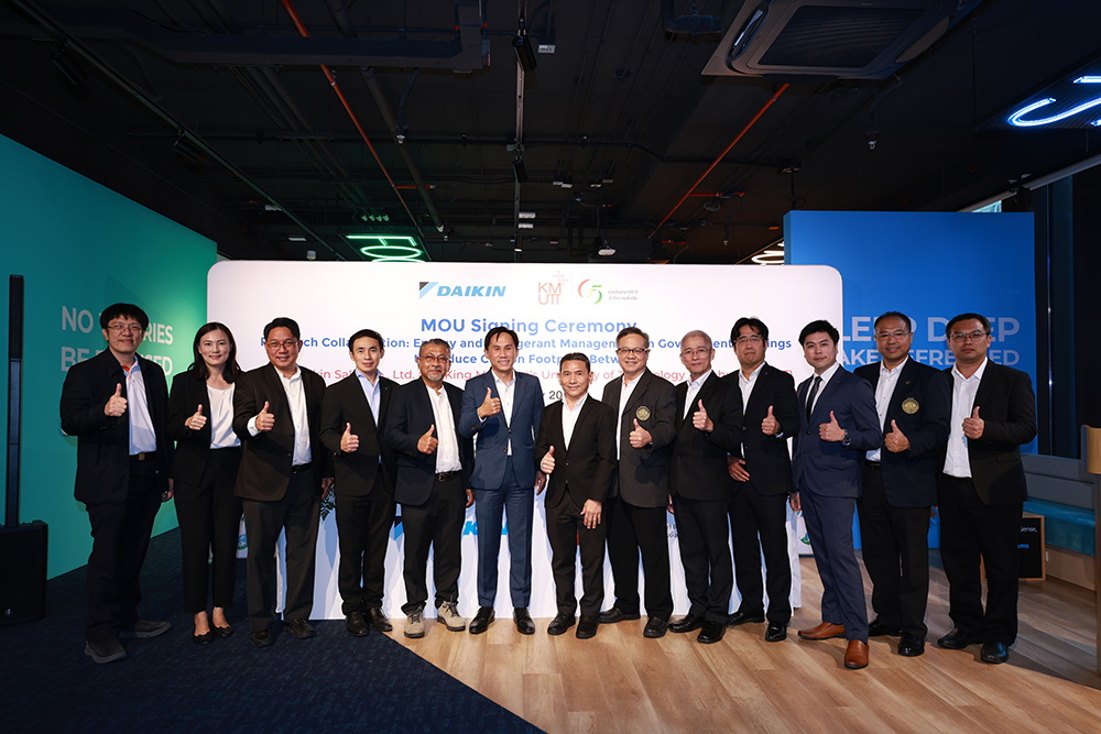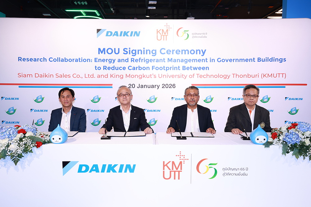 บริษัท สยามไดกิ้นเซลส์ จำกัด และมหาวิทยาลัยเทคโนโลยีพระจอมเกล้าธนบุรี (มจธ.) ร่วมลงนามบันทึกข้อตกลงความร่วมมือด้านการวิจัย (MOU) เพื่อขับเคลื่อน “การศึกษาวิจัยเรื่อง การจัดการพลังงานและสารทำความเย็นในอาคารภาครัฐเพื่อลดคาร์บอนฟุตพริ้นท์ของอาคาร” พร้อมยกระดับเป้าหมายด้านความยั่งยืน (Sustainability) โดยมอบ “อากาศที่ดี” ร่วมกับ “พลังงานที่มีประสิทธิภาพ” ผ่านการวิจัยและพัฒนาเทคโนโลยีที่ช่วยปรับปรุง IAQ ควบคู่การออกแบบและควบคุมระบบปรับอากาศให้ใช้พลังงานอย่างคุ้มค่า พร้อมยกระดับแนวทางการควบคุมมลพิษอย่างยั่งยืนในระยะยาว ให้สอดคล้องกับเป้าหมายด้าน Carbon Neutrality และการลดการปล่อยก๊าซเรือนกระจกที่กำลังเป็นวาระร่วมขององค์กรทุกภาคส่วน