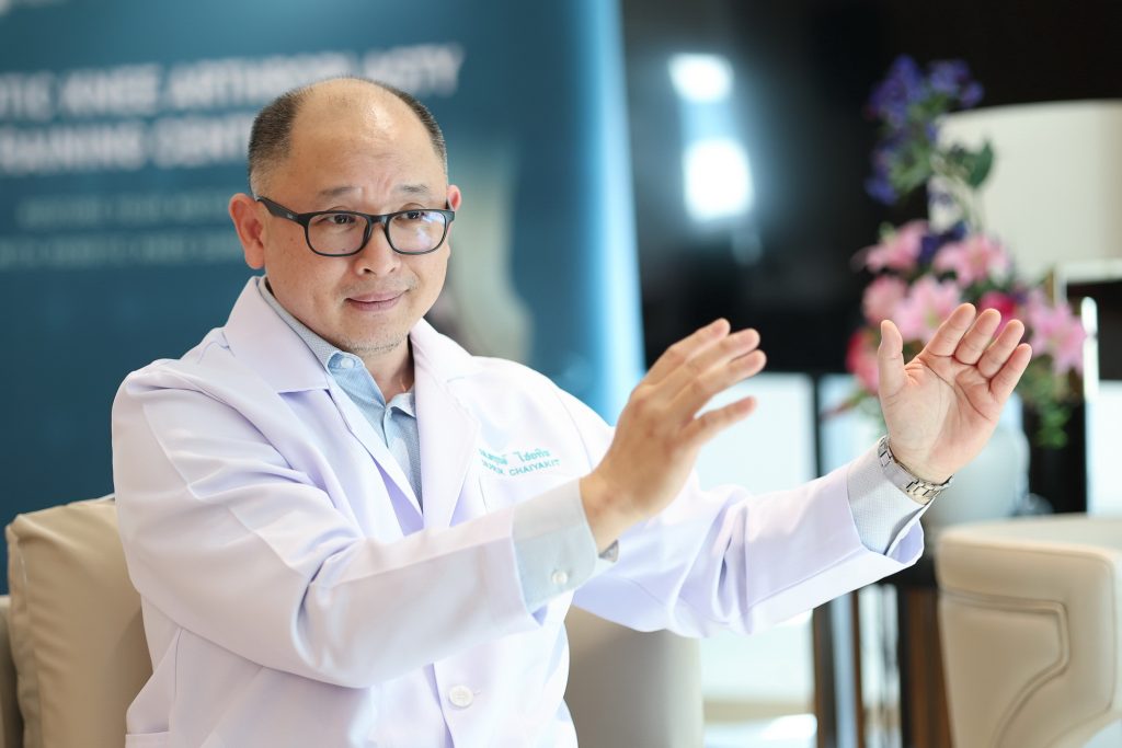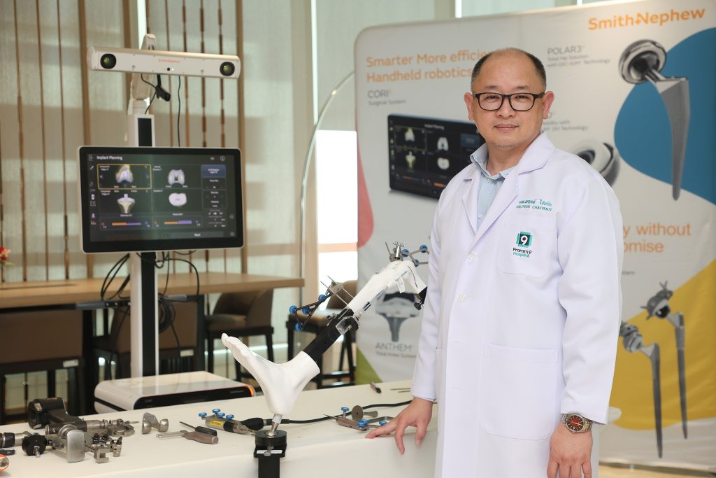 รศ.นพ.พฤกษ์ ไชยกิจ หัวหน้าศูนย์รักษ์ข้อ โรงพยาบาลพระรามเก้า เปิดเผยว่า การผ่าตัดเปลี่ยนข้อเข่าแบบดั้งเดิมอาศัยประสบการณ์และการประเมินด้วยสายตาของศัลยแพทย์ ซึ่งอาจเกิดความคลาดเคลื่อนได้ ขณะที่การใช้หุ่นยนต์ช่วยผ่าตัด จะมีระบบคอมพิวเตอร์และแขนกลช่วยวางแผนและควบคุมการตัดกระดูกอย่างแม่นยำ ส่งผลให้ผู้ป่วยเจ็บน้อย ขยับข้อเข่าได้ดี ฟื้นตัวเร็ว และช่วยยืดอายุการใช้งานของข้อเข่าเทียมในระยะยาว