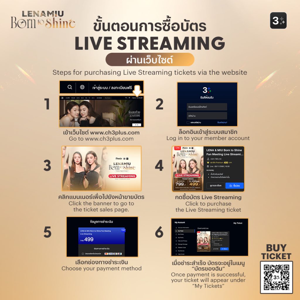 กระแสแรงไม่มีคำว่าเบา ตั้งแต่ประกาศจัดงานแฟนมีตติ้งครั้งแรกของคู่สุดฮอต “ลีน่า – หมิว” กับงาน “LENAMIU Born to Shine Fan Meeting” ที่ได้รับการตอบรับอย่างล้นหลามจากชาว Gumber bear จนบัตรเข้าร่วมงานถูกจับจอง Sold Out อย่างรวดเร็ว สำหรับใครที่พลาดบัตรหน้างานไปไม่ต้องเสียใจ 3Plus เปิดโอกาสให้แฟน ๆ ได้ร่วมเป็นส่วนหนึ่งของโมเมนต์สุดพิเศษ ผ่าน Live Streaming ให้รับชมสดออนไลน์ สัมผัสบรรยากาศแฟนมีตแบบใกล้ชิดผ่านหน้าจอ ไม่ว่าจะอยู่ที่ไหนก็ฟินไปพร้อมกันได้