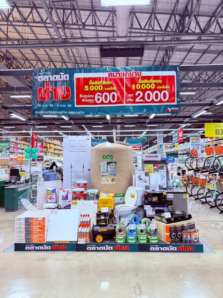 เมกาโฮม ศูนย์รวมวัสดุก่อสร้างและงานช่าง (บริษัทฯ ในเครือภายใต้การดูแลของโฮมโปรเดินหน้ากระตุ้นตลาดงานช่างต้นปี จัดอีเว้นต์ “ตลาดนัดช่าง – ถูกจริง! สินค้าเพื่อช่าง” รวบรวมดีลสำหรับงานก่อสร้าง งานช่าง และสินค้าเรื่องบ้าน จัดเต็มโปรโมชั่นทุบราคาให้ช่างและผู้รับเหมาซื้อคุ้มกว่าเดิม ลดสูงสุด 75% พร้อมสารพัดดีลแรงตลอด 11 วันเท่านั้น ระหว่างวันที่ 29 มกราคม 2569 – 8 กุมภาพันธ์ 2569 ที่เมกาโฮมทุกสาขาทั่วประเทศ
