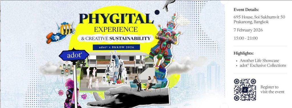 adot° หนึ่งในโปรแกรมจัดแสดง (Exhibition) ของ Bangkok Design Week 2026 (BKKDW2026) นำเสนอนิทรรศการที่สำรวจมิติใหม่ของความคิดสร้างสรรค์กับ adot° Exclusive Collections ที่ผสานทั้งโลกกายภาพ (Phygital) และโลกดิจิทัล (Digital) กันได้อย่างกลมกลืน ซึ่งการจัดแสดงผลงานสร้างสรรค์นี้ มีจุดประสงค์เพื่อเปิดโอกาสให้ผู้ชมงานได้มีปฏิสัมพันธ์และสัมผัสผลงานในแบบใหม่ พร้อมกับการชมผลงานจากนักสร้างสรรค์หลายสาขา ที่เน้นความยั่งยืนและแนวคิด creative sustainability ในมุมมองแตกต่าง พร้อมด้วยประสบการณ์เชิงทดลอง และการพบปะพูดคุยของชุมชนครีเอเตอร์