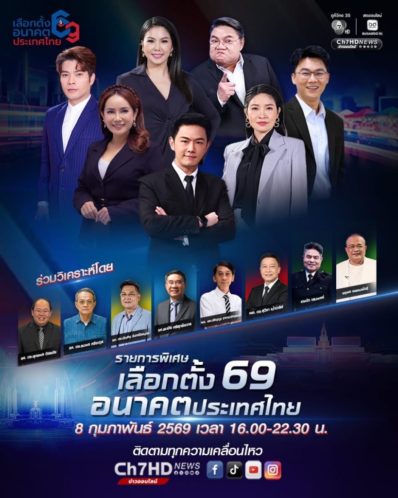 ติดตามชม รายการพิเศษ “เลือกตั้ง 69 อนาคตประเทศไทย” ในวันอาทิตย์ที่ 8 กุมภาพันธ์นี้ ตั้งแต่เวลา 16.00 น.  ทางช่อง 7HD กด 35 และสามารถติดตามข่าวสารความเคลื่อนไหว เลือกตั้ง 69 ได้ทาง ช่อง 7HD ดูทีวีกด 35 สดออนไลน์ BUGABOO.TV  และช่องทางออนไลน์ Ch7HD NEWS (Facebook, IG, Tiktok)  Ch7HD (Facebook, IG, TikTok, X และ YouTube) และเว็บไซต์  www.ch7.com/election2569