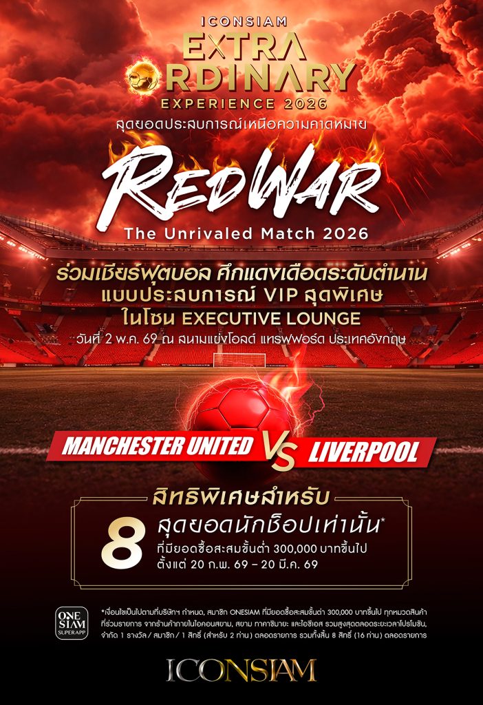 ไอคอนสยาม แลนด์มาร์กระดับโลกริมแม่น้ำเจ้าพระยา ตอกย้ำความเป็น Global Experiential Destination ด้วยแคมเปญสุดเอ็กซ์คลูซีฟ “THE EXTRAORDINARY EXPERIENCE 2026 : RED WAR The Unrivaled Match 2026” ชวนลูกค้าคนพิเศษไปเชียร์ทีมโปรดกับศึกแดงเดือดระดับตำนาน “แมนเชสเตอร์ ยูไนเต็ด” ปะทะ “ลิเวอร์พูล” แบบสดๆ ติดขอบสนาม รับชมแมตช์แดงเดือดพร้อมสัมผัสประสบการณ์ VIP สุดพิเศษ จากที่นั่งโซน Executive Lounge ณ สนามโอลด์ แทรฟฟอร์ด เมืองแมนเชสเตอร์ ประเทศอังกฤษ สิทธิพิเศษนี้สำหรับ 8 สุดยอดนักช็อป ลูกค้าคนสำคัญของไอคอนสยามเท่านั้น