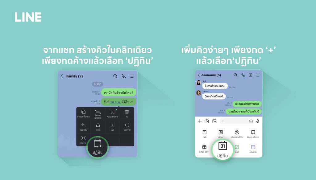 หนึ่งในพฤติกรรมที่ผู้ใช้จำนวนมากคุ้นเคย คือ การนัดหมายกันยาวในแชท แต่สุดท้ายลืมบันทึกลงปฏิทิน หรือมีตารางกระจัดกระจายอยู่หลายแอป LINE จึงพัฒนาฟีเจอร์ ‘ปฏิทิน’ บน LINE เพื่อให้ทุกการนัดหมาย “ครบจบในที่เดียว” ได้ ไม่ว่าจะเป็นการนัดเพื่อนหรือเรื่องสำคัญ สามารถสร้างได้ง่าย ๆ บน LINE โดยไม่ต้องสลับไปใช้งานแพลตฟอร์มอื่น