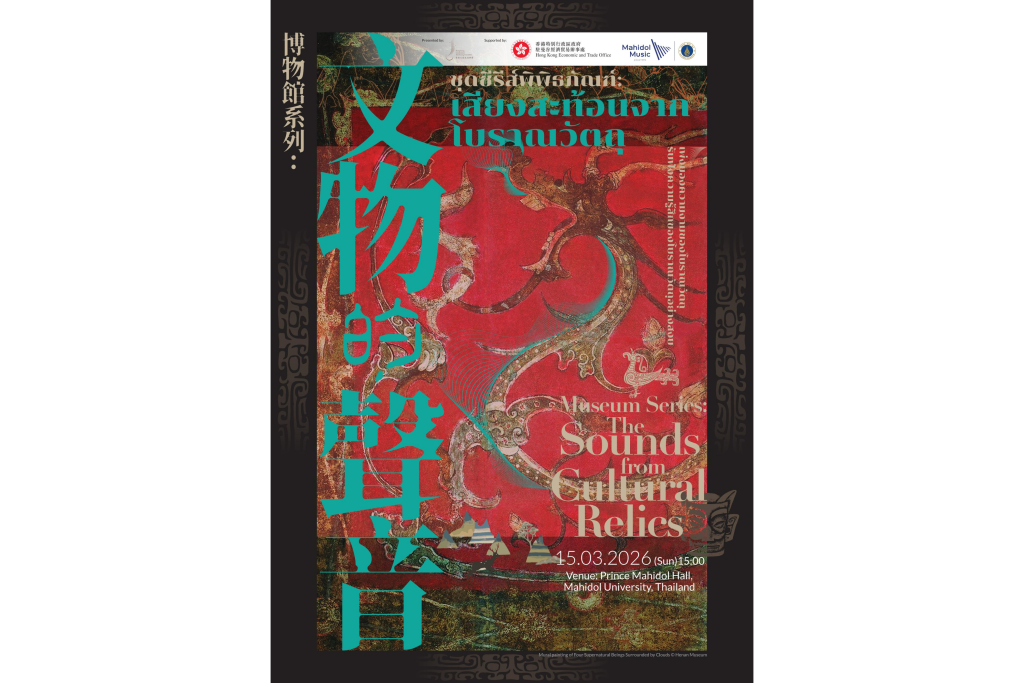 เสียงสะท้อนจากโบราณวัตถุ (Museum Series: The Sounds from Cultural Relics) คณะดนตรีเกาเดอมัส ตุนหวง ฮ่องกง (Hong Kong Gaudeamus Dunhuang Ensemble) ร่วมกับ มหาวิทยาลัยมหิดล ขอเชิญทุกท่านร่วมสัมผัสประสบการณ์ดนตรีที่พา “โบราณวัตถุมีชีวิต” ผ่านเสียงเพลง คณะดนตรีเกาเดอมัส ตุนหวง ฮ่องกง ปลุกเรื่องราวจากแหล่งอารยธรรมที่ยืนยาวนับศตวรรษ แรงบันดาลใจจากเมืองโบราณตุนหวง บนเส้นทางสายไหม สู่ศิลปะพุทธศาสนาและจิตรกรรมฝาผนังอันเลื่องชื่อ ผสานแรงบันดาลใจจากศิลปะราชสำนักจีนแห่ง The Palace Museum และโบราณวัตถุล้ำค่าจาก Sanxingdui Museum