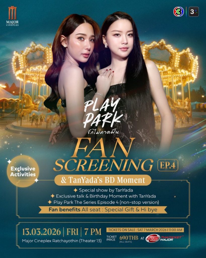 เตรียมจับจองบัตรไปฟินไปฮ็อบกันให้ฮอลล์แตก กับงานสุดเอ็กซ์คลูซีฟ “Play Park รักไม่คาดฝัน Fan Screening EP4 & TanYada’s BD Moment” ที่สองสาว “แทน ดวงแก้ว” และ “ญดา นริลญา” พร้อมพาแฟน ๆ ไปชมความน่ารัก ตอนที่ 4 ของซีรีส์ “Play Park รักไม่คาดฝัน” พร้อมฉลองโมเมนต์พิเศษของสองสาวแบบใกล้ชิดสุด ๆ