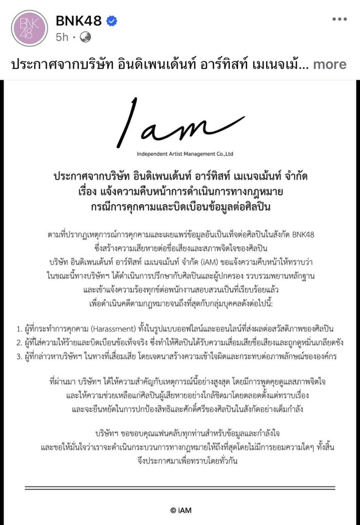 ทางต้นสังกัด Independent Artist Management (อินดิเพนเด้นท์ อาร์ทิสท์ เมเนจเม้นท์) หรือ ค่าย iAM บริษัทผู้ดูแลศิลปินไอดอล BNK48&CGM48 เดือด! แจ้งความเอาผิดผู้ตัดต่อภาพลามกอนาจาร หรือแชร์ข้อความเผยแพร่สังคมบนสื่อออนไลน์ที่ทำเกิดความเสียหายกระทบต่อศิลปิน กล่าวอ้างข้อมูลที่เป็นเท็จทำให้เกิดความเสื่อมเสียและทำให้เข้าใจผิดไปได้ว่าเป็นศิลปินในสังกัด พร้อมเอาผิดผู้คุกคามพื้นที่ส่วนตัว รวมถึงการนำข้อมูลส่วนตัวศิลปินมาเผยแพร่ในพื้นที่สาธารณะ โดยมิได้รับการยินยอมจากตัวศิลปินและทางค่าย โดย “ป๊อปเป้อ-พิณญาดา จึงกาญจนา” ชิไฮนิน BNK48 (ผู้จัดการวง) ได้โพสต์ข้อความระบุว่า