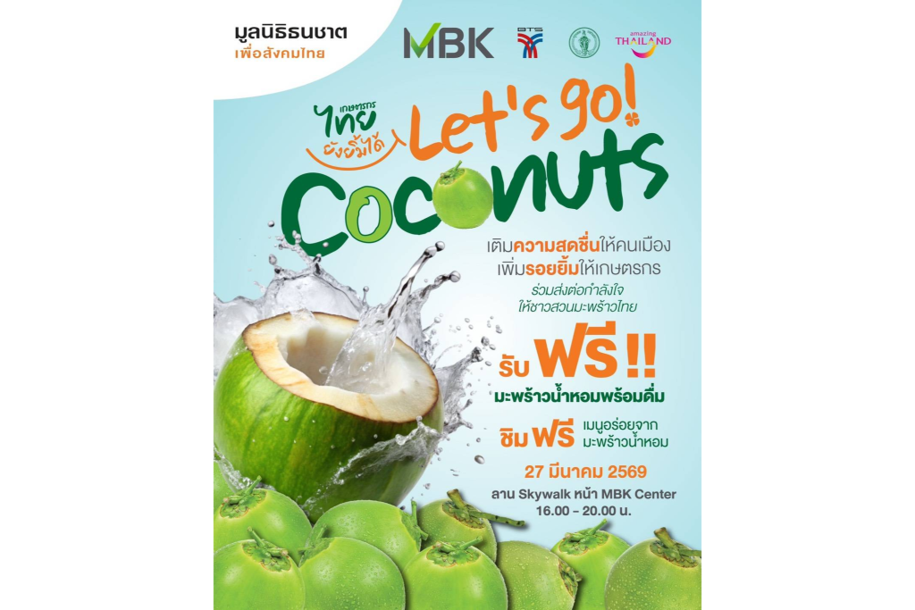 การท่องเที่ยวแห่งประเทศไทย และ BTS จัดกิจกรรม “เกษตรกรไทยยังยิ้มได้ : Let’s go! Coconuts” เพื่อช่วยบรรเทาความเดือดร้อนของเกษตรกรผู้ปลูกมะพร้าวน้ำหอมที่กำลังได้รับผลกระทบจากภาวะราคาผลผลิตตกต่ำ โดยมีเป้าหมายเพื่อช่วยระบายผลผลิต สร้างรายได้ และส่งต่อกำลังใจให้เกษตรกรสามารถดำรงอาชีพได้อย่างมั่นคง กิจกรรมดังกล่าวจะจัดขึ้นในวันศุกร์ที่ 27 มีนาคม 2569 ตั้งแต่เวลา 16.00 น. เป็นต้นไป ณ ลานสกายวอล์ค ชั้น 2 ศูนย์การค้าเอ็ม บี เค เซ็นเตอร์