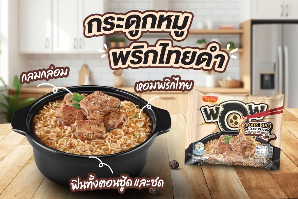 ว้าวที่ซุป ยิ่งซู้ดยิ่งว้าวว กับ WaiWai WOW รสกระดูกหมูพริกไทยดำ ที่โดดเด่นด้วยซุปเข้มข้นหอมพริกไทยดำแท้ ๆ อย่างชัดเจน ให้กลิ่นหอม เผ็ดร้อนกำลังดีในทุกคำ ผสานความกลมกล่อมของซุปกระดูกหมูที่ให้รสลึกและหนักแน่น ยิ่งซดก็ยิ่งหอม ยิ่งกินก็ยิ่งเพลิน เหมาะสำหรับคนที่ชื่นชอบรสชาติสไตล์ซุปเข้มข้น