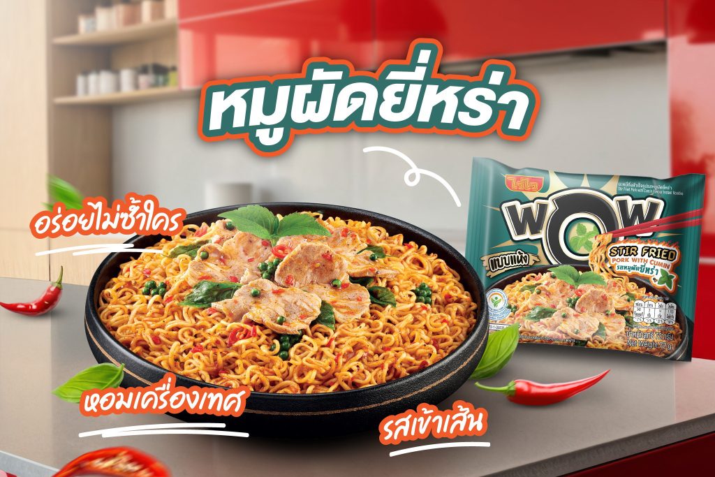 ว้าวเผ็ดร้อน แบบแห้งมิติใหม่ กับ WaiWai WOW รสหมูผัดยี่หร่า ที่ถ่ายทอดเสน่ห์ของเมนูผัดกระทะร้อนสไตล์ไทยได้อย่างลงตัว โดดเด่นด้วยกลิ่นหอมเฉพาะตัวของยี่หร่า ผสานรสหมูผัดเข้มข้น และเครื่องเทศที่ให้รสจัดจ้านแบบถึงเครื่อง ทำให้ทุกคำเต็มไปด้วยมิติของกลิ่น และรสชาติที่แตกต่าง เป็นอีกหนึ่งรสชาติที่สร้างประสบการณ์ใหม่ให้กับบะหมี่กึ่งสำเร็จรูป