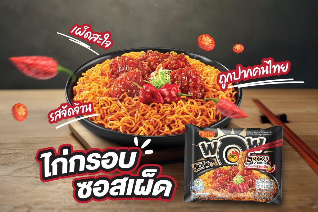ว้าวไฟลุกด้วยพริกโกสท์เปปเปอร์ กับ WaiWai WOW รสไก่กรอบซอสเผ็ด เผ็ดจัดจ้านแบบไล่ระดับ โดดเด่นด้วยรสเผ็ดจัดจ้านของ พริก Ghost Pepper ที่ให้ความเผ็ดแบบไล่ระดับ เข้ากันอย่างลงตัวกับความหอมของไก่กรอบ รสชาติจัดจ้าน กินแล้วได้อารมณ์เหมือนเมนูไก่ทอดคลุกซอสสุดฮิต เพิ่มความพิเศษในมื้อบะหมี่ตามสไตล์สายว้าว