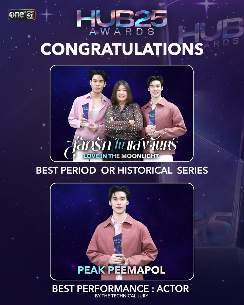 ประสบความสำเร็จปังไกลระดับโลก กับคอนเทนต์คุณภาพของ One31 ที่ล่าสุด คว้า 2 รางวัล ในงานประกาศรางวัล HUB Awards 2025 เป็นงานประกาศรางวัลที่ใหญ่ที่สุด ที่จัดขึ้นเพื่อ คอนเทนต์ BL (Boys Love) และ GL (Girls Love) นอกทวีปเอเชีย โดยละคร “สลักรักในแสงจันทร์”Love in the Moonlight ที่นำแสดงโดย เพิร์ล-ศัจกร ฉลาด และพีค-ภีมพล พาณิชย์ธำรงกำกับการแสดงโดย ผอูน จันทรศิริ ได้รับรางวัลในสาขา BEST PERIOD OR HISTORICAL SERIES (ซีรีส์ย้อนยุคหรือซีรีส์อิงประวัติศาสตร์ยอดเยี่ยม) จากการโหวตของแฟนคลับ BL และ GL ทั่วโลก โดยในงานนี้ มีจำนวนการโหวตทั่วโลกมากถึง 80 ล้านโหวต และมีแฟนๆ ที่ร่วมโหวตมากถึง 140,000 คนจากทุกมุมโลก นอกจากนี้นักแสดงหนุ่มมากความสามารถ พีค-ภีมพล พาณิชย์ธำรง ยังได้รับรางวัล BEST PERFORMANCE : ACTOR (นักแสดงนำชายยอดเยี่ยม) จากการตัดสินโดยกรรมการผู้ทรงคุณวุฒิ จากบทบาทของ เจ้าแสนแก้ว ในละคร “สลักรักในแสงจันทร์”Love in the Moonlight จนชนะใจกรรมการผู้ทรงคุณวุฒิด้วยฝีไม้ลายมือที่ถ่ายทอดอารมณ์ออกมาได้อย่างลึกซึ้ง จนแฟนๆ ทั่วโลกต่างยอมรับ