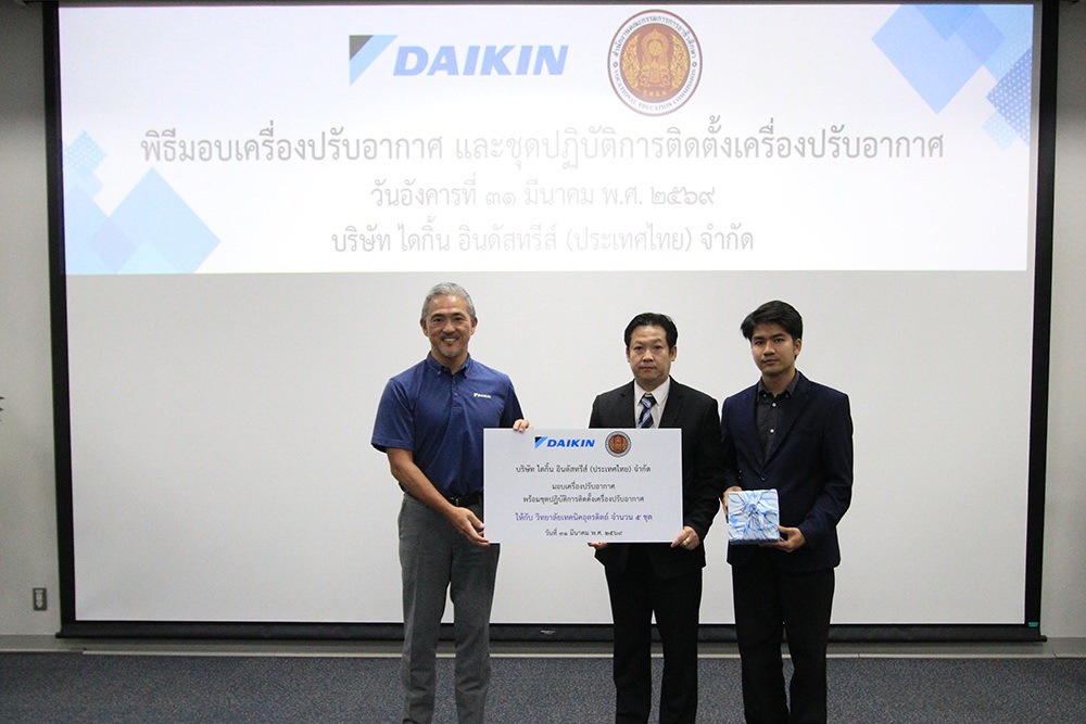 บริษัท ไดกิ้น อินดัสทรีส์ (ประเทศไทย) จำกัด และ บริษัท สยามไดกิ้นเซลส์ จำกัด ตอกย้ำความร่วมมือกับสำนักงานคณะกรรมการการอาชีวศึกษา (สอศ.) เดินหน้าสร้างอนาคตช่างปรับอากาศไทย ส่งมอบเครื่องปรับอากาศและชุดปฏิบัติการติดตั้งรวม 42 ชุด ให้แก่ 15 สถานศึกษาทั่วประเทศ ขับเคลื่อนวิสัยทัศน์ส่งเสริมเทคโนโลยีการเรียนการสอน เปิดโอกาสให้นักศึกษาลงมือปฏิบัติกับอุปกรณ์จริง มุ่งลดการขาดแคลนแรงงานฝีมือ พร้อมยกระดับทักษะฝีมือแรงงานไทยสู่มาตรฐานสากล