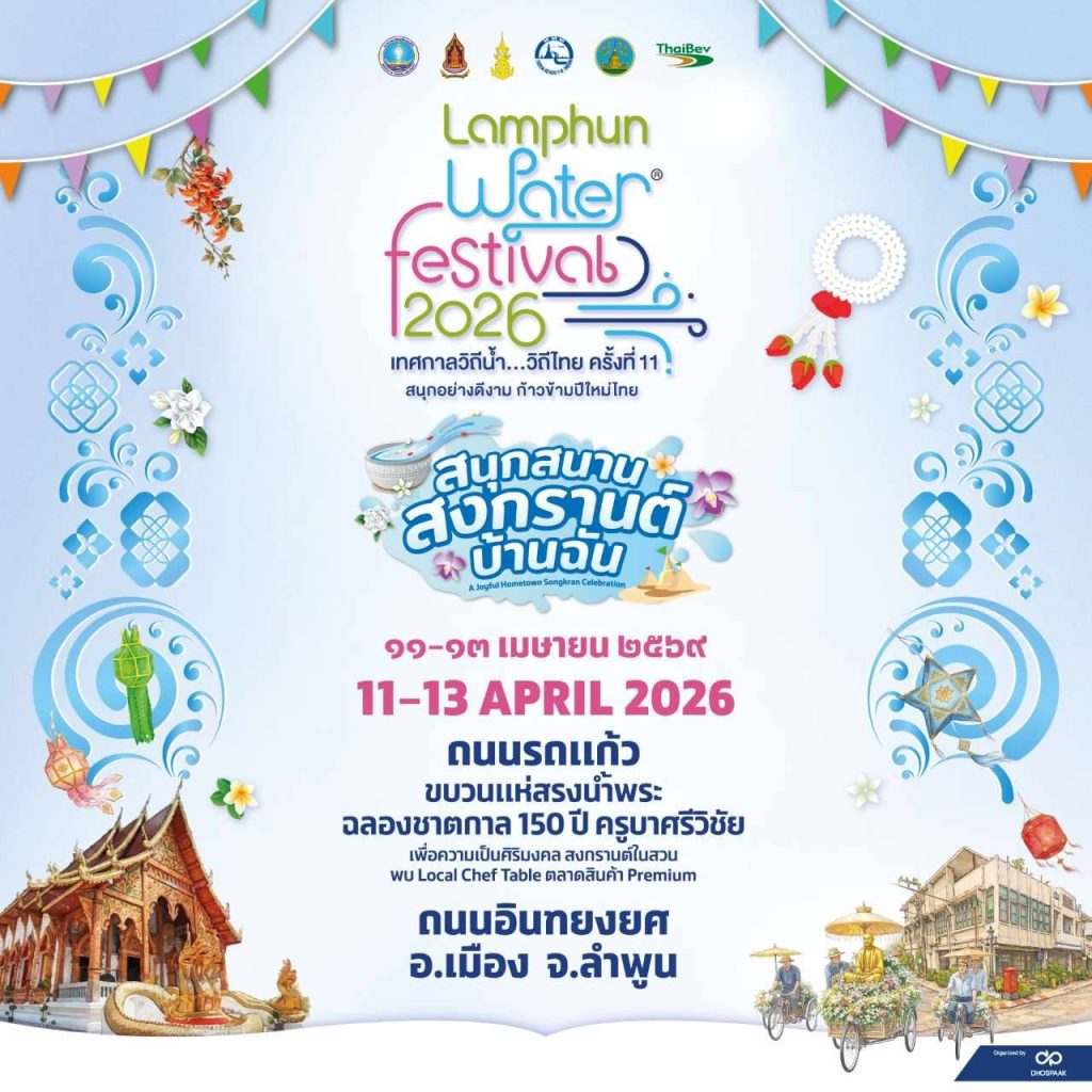 จังหวัดลำพูน ที่ถนนรถแก้ว – ถนนอินทยงยศ จัดขึ้นระหว่างวันที่ 11-13 เมษายน 2569 ร่วมขบวบแห่สรงน้ำพระฉลองชาติกาล 150 ปีครูบาศรีวิชัย บริเวณถนนรถแก้ว ดื่มด่ำบรรยากาศสงกรานต์ในสวน พบ Local Chef Table เมนูอาหารที่เน้นวัตถุดิบท้องถิ่นโดยเชฟเป็นผู้ออกแบบรังสรรค์เมนู นอกจากนี้พบกับตลาดนัดสินค้าคุณภาพมากมาย