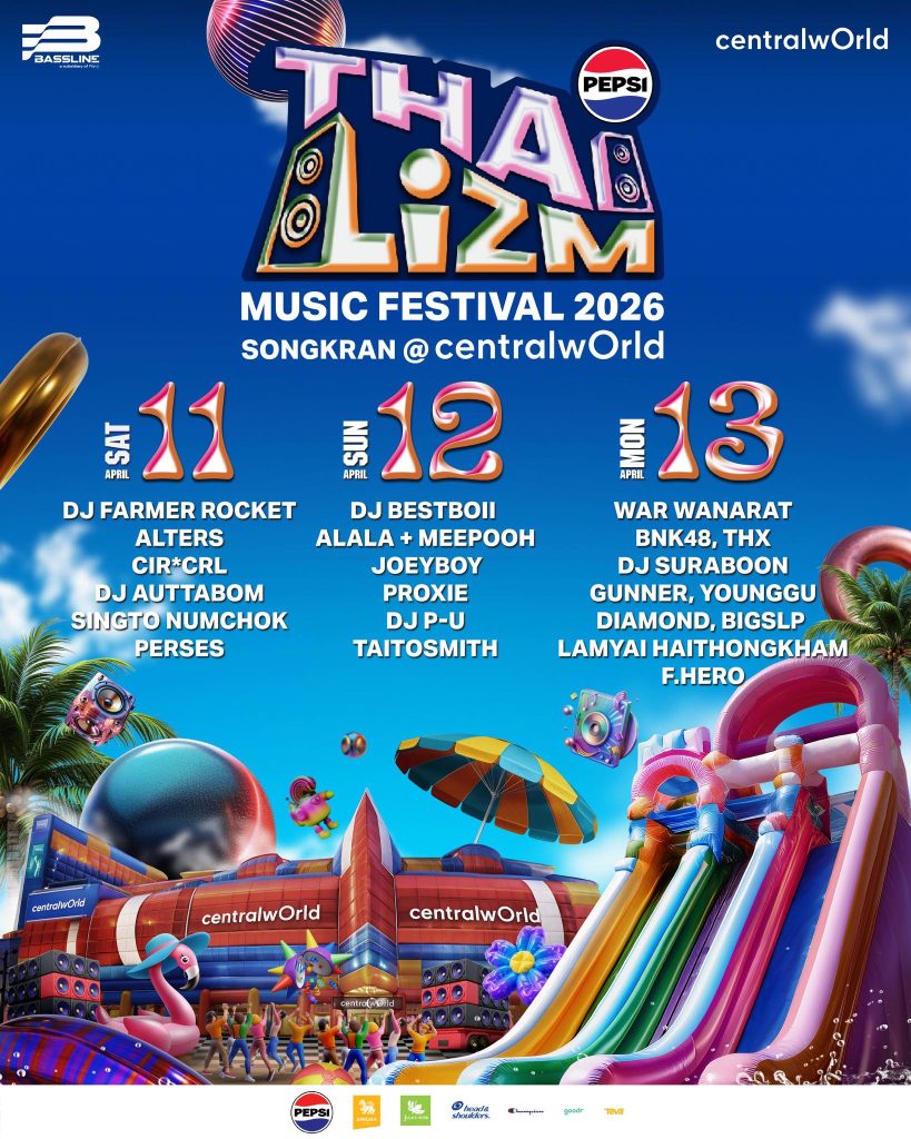 ความสนุกพุ่งสุดที่ “PEPSI Presents THAI LIZM 2026” เมื่อ ‘เซ็นทรัลเวิลด์’ ผนึกกำลัง บริษัท เบสไลน์เอ็นเตอร์เทนเมนต์ บริษัทในเครือของ PlanB Media จับมือการท่องเที่ยวแห่งประเทศไทย และพันธมิตรชั้นนำ ได้แก่ บริษัท ซันโทรี่ เป๊ปซี่โค เบเวอเรจ (ประเทศไทย) จำกัด, การท่องเที่ยวแห่งประเทศไทย (ททท.), สิงห์ ไลฟ์, บริษัท เจแอลซี กรุ๊ป จำกัด (จุฬาเฮิร์บ), บริษัท พรอคเตอร์ แอนด์ แกมเบิล เทรดดิ้ง (ประเทศไทย) จำกัด, บริษัท เรฟ อีดิชั่น จำกัด สร้างปรากฏการณ์ดนตรีที่สนุกที่สุดในประเทศไทย ยกเวทีคอนเสิร์ตมาไว้ใจกลางกรุงเทพฯ กับสงกรานต์ยกหาดสาดคลื่นปาร์ตี้ ที่จะทำให้คุณ “เปียกแบบป๊อปๆ” พร้อมไลน์อัปศิลปินและดีเจแน่นตลอด 3 วัน