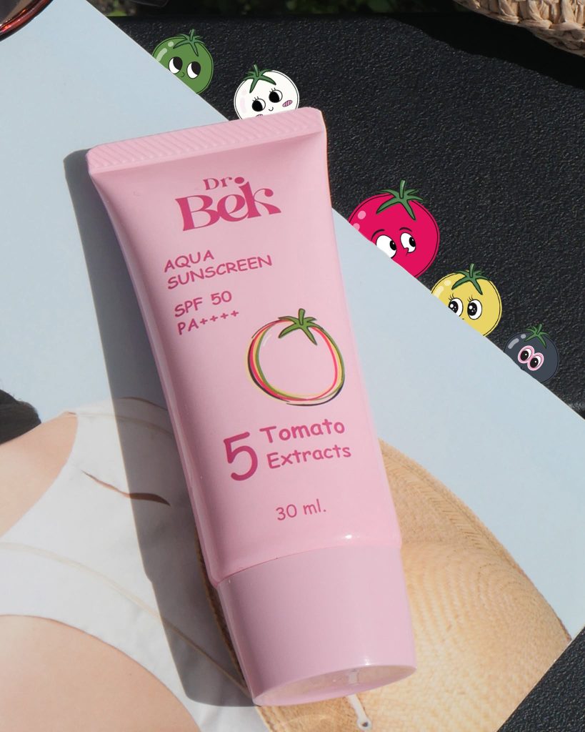 ขั้นตอนสุดท้าย ปกป้องผิวหน้าด้วย Dr.Bek Aqua Sunscreen SPF50 PA++++ (ด๊อกเตอร์ เบค อควา ซันสกรีน เอสพีเอฟ 50 พีเอ ++++) กันแดดสูตรน้ำ เนื้อบางเบา เกลี่ยง่าย อ่อนโยนต่อผิว ไม่ก่อให้เกิดการอุดตัน พร้อมบำรุงผิวด้วยสารสกัดจากมะเขือเทศ 5 สี ช่วยปกป้องผิวจากรังสี UVA และ UVB ทำให้ผิวดูสว่างกระจ่างใสขึ้นอีก 1 ระดับ สามารถทาทับเมคอัพได้ ไม่เป็นคราบ จำหน่าย ขนาด 30 ml ราคาหลอดละ 390 บาท