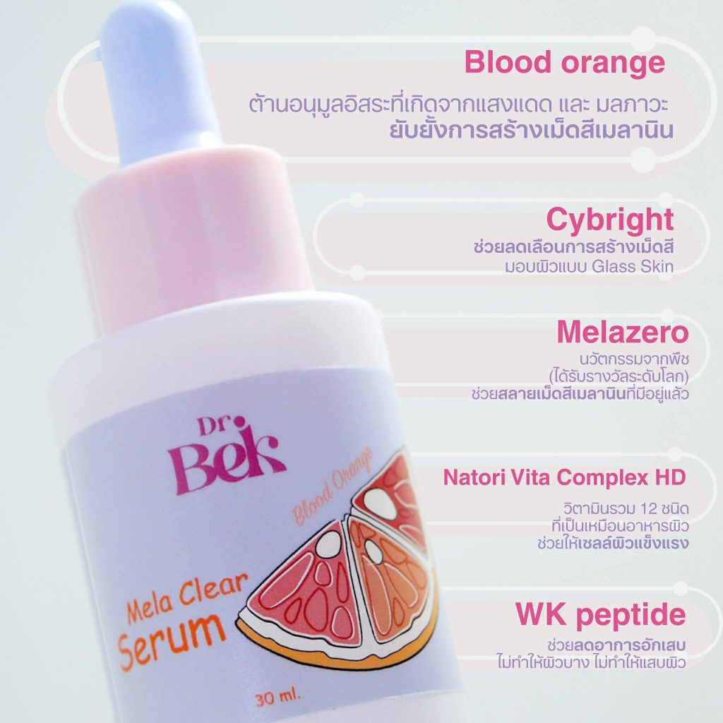 เริ่มขั้นตอนแรกด้วย Dr.Bek Mela Clear Serum (ด๊อกเตอร์ เบค เมลา เคลียร์ เซรั่ม) อุดมไปด้วยสารสกัดจากส้มสีเลือด 3 สายพันธุ์ (Blood orange) ที่มีสารต้านอนุมูลอิสระมากกว่าส้มทั่วไปถึง 9 เท่า ช่วยยับยั้งการสร้างเม็ดสีเมลานินใหม่ ผสานพลังจากสาหร่ายสีรุ้งออร์แกนิก (Cybright) ช่วยลดเลือนจุดด่างดำ เผยผิวหน้ากระจ่างใสแบบ Glass Skin พร้อมด้วย MelaZero (เมลาเซโร) นวัตกรรมสารสกัดจากพืชที่ได้รับรางวัลระดับโลก ช่วยสลายเม็ดสีเมลานินที่สะสมอยู่แล้ว เสริมด้วย WK Peptide (ดับเบิลยูเค เปปไทด์) ช่วยลดการอักเสบของผิว และ Natori Vita Complex HD (นาโทริ วิตา คอมเพล็กซ์ เอชดี) วิตามินรวม 12 ชนิด บำรุงลึกเสมือนเติมอาหารผิวครบ 5 หมู่ ช่วยให้เซลล์ผิวแข็งแรงจากภายใน จำหน่าย ขนาด 30 ml ราคาขวดละ 590 บาท