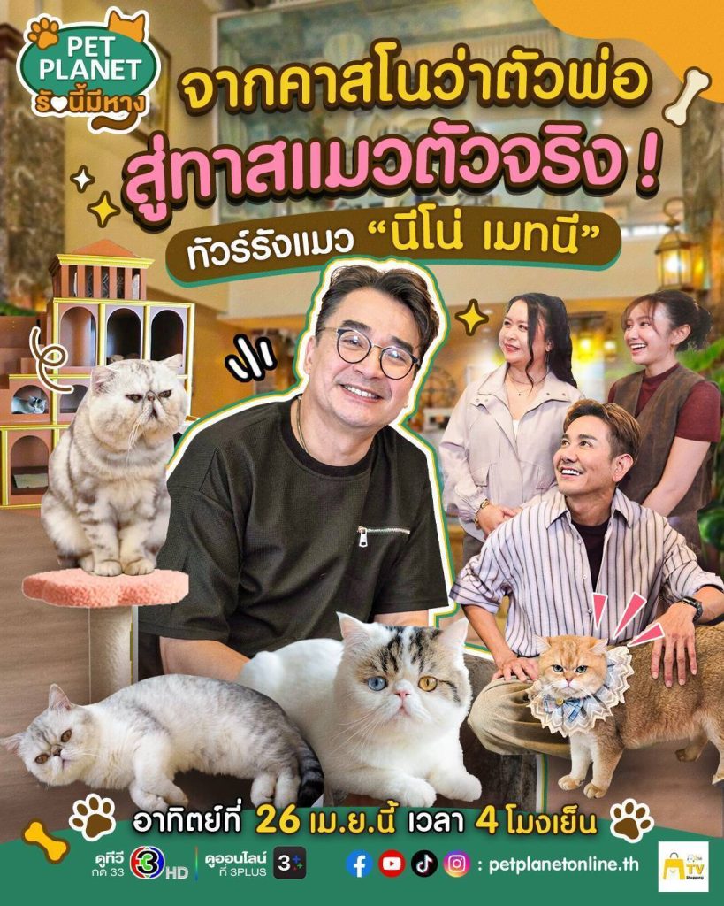 รายการ “PET Planet รักนี้มีหาง” อาทิตย์ที่ 26 เมษายน 2569 นี้ สามพิธีกรสุดคิวบ์ เอ ไชยา, เอ๋ ดาเรศ และ น้องแป้ง ศรัณฉัตร จะพาแฟนๆ รายการไปชม “ Cigar Cat Boutique Hotel” ” สำหรับ น้องแมว ที่ หนุ่มนีโน่ ฟูกฟักบรรดา “ลูกรัก” และยังเปิดให้บริการสำหรับคุณพ่อคุณแม่ “ทาสแมว” อีกด้วย