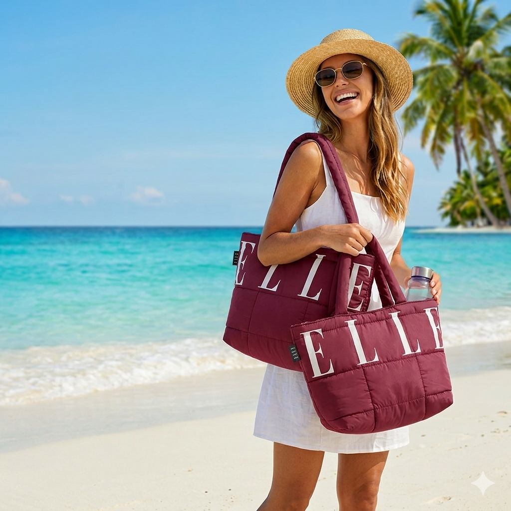 เริ่มกันที่ ELLE Puffy Marshmallow Bag กระเป๋าผ้าดีไซน์พัฟฟี่โท้ท (Puffy Tote) ที่มอบลุค Modern & Playful ด้วยผิวสัมผัสนุ่มเหมือนมาร์ชแมลโลว์ ให้ความรู้สึกสบายแม้ใช้งานในวันที่อากาศร้อน กระเป๋าถูกออกแบบมาอย่างใส่ใจ ทั้งสายคล้องไหล่เสริมฟองน้ำด้านใน ช่วยซัพพอร์ตและรองรับน้ำหนักได้ดี โดดเด่นด้วยโลโก้ ELLE ขนาดใหญ่ เสริมกลิ่นอายสาวปารีเซียง มีให้เลือกหลายเฉดสีคลาสสิก ได้แก่ Beige, Black, Red Maroon, Off White และ Green พร้อม 3 ขนาด ให้เลือกตามการใช้งาน