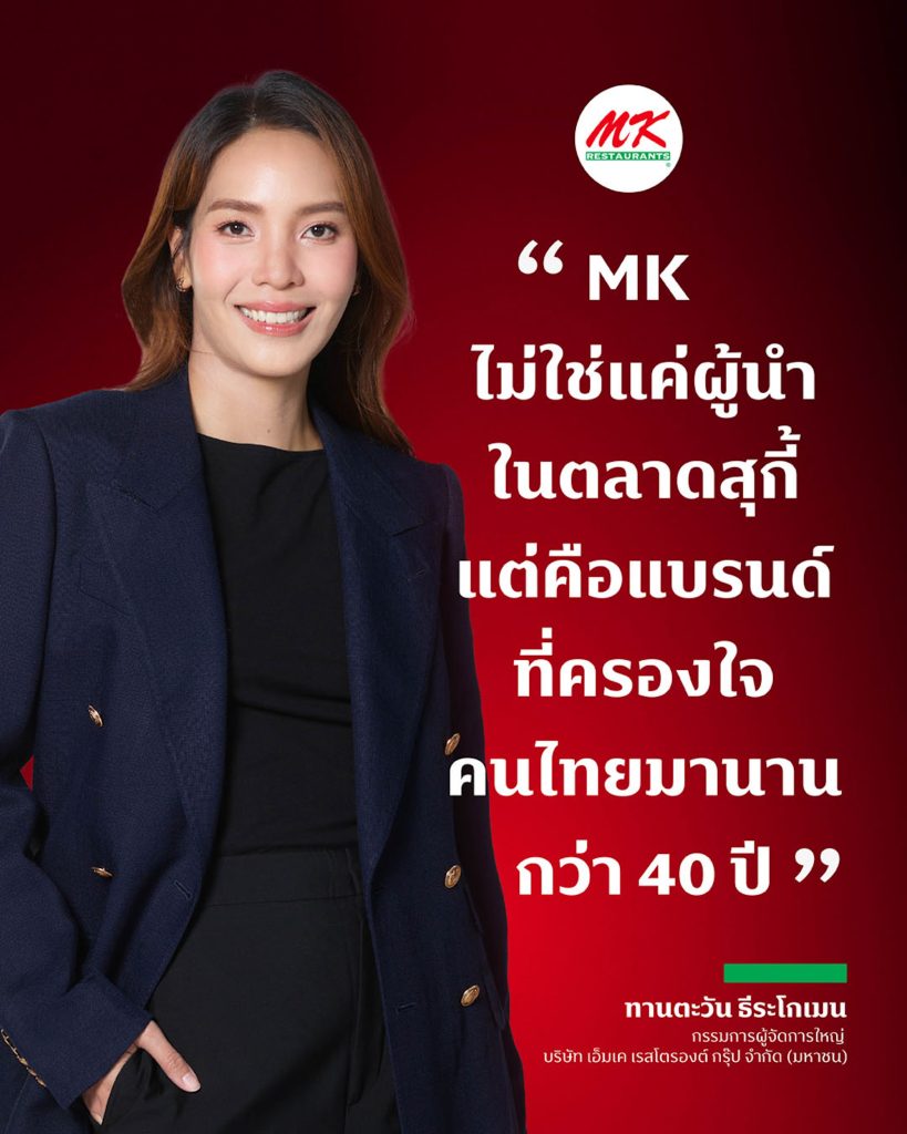 ตลอด 40 ปีที่ผ่านมา MK Restaurants ไม่เพียงแค่สร้างเมนูสุกี้คุณภาพ แต่ยังสร้างความผูกพันที่ยาวนานระหว่างแบรนด์และลูกค้า ผ่านการเชื่อมโยงที่สอดคล้องกับทุกช่วงชีวิตของคนไทย โดยทุกการเปลี่ยนแปลงที่ MK ทำล้วนเกิดจากความตั้งใจที่จะตอบสนองความต้องการที่แท้จริงของลูกค้า ทำให้แบรนด์ไม่เพียงแค่ให้บริการอาหาร แต่เป็นส่วนหนึ่งของคนไทยทุกครอบครัว สะท้อนถึงความตั้งใจของแบรนด์ตั้งแต่วันแรกจนถึงวันนี้ที่ยังคงอยู่เฉกเช่นเดิม