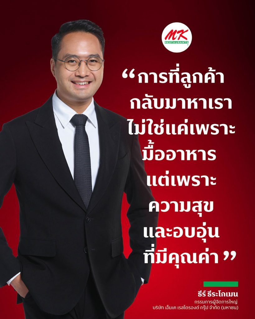 คุณธีร์ ธีระโกเมน กรรมการผู้จัดการใหญ่ บริษัท เอ็มเค เรสโตรองต์ กรุ๊ป จำกัด (มหาชน) กล่าวว่า “การที่ลูกค้ากลับมาหาเรา ไม่ใช่แค่เพราะเราขายสุกี้ แต่เพราะเราขายความสุขและความอบอุ่นที่มีค่ามากกว่าเวลา ในทุกความสำเร็จจะเกิดขึ้นไม่ได้หากขาดลูกค้าและพนักงานทุกคน ต้องขอขอบคุณลูกค้าทุกท่านที่มอบความไว้วางใจให้กับเรา และขอบคุณความตั้งใจของพนักงานทุกคน ซึ่งเราจะไม่หยุดพัฒนา ทั้งในด้านคุณภาพสินค้า การบริการ และประสบการณ์ที่ดี เพื่อให้ทุกความสุขยังอุ่นเสมอ พร้อมทั้งมุ่งมั่นที่จะสร้างความประสบการณ์ใหม่ ๆ ที่มีคุณค่าให้กับลูกค้าทุกคนในอนาคตต่อไป”