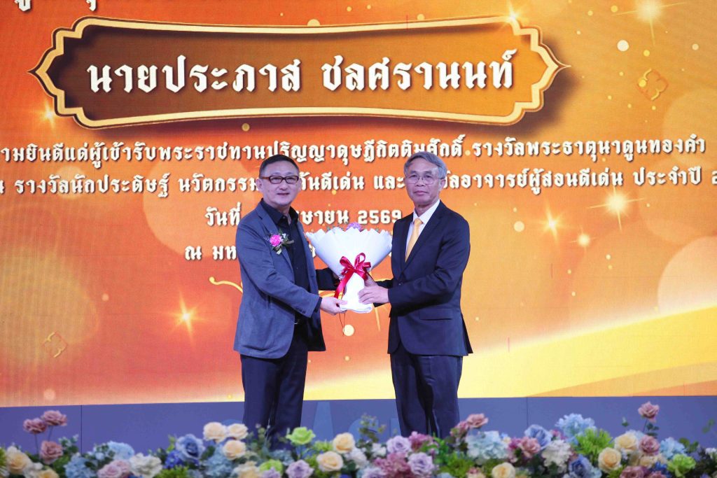 คุณประภาส ชลศรานนท์ รับพระราชทานรางวัล “พระธาตุนาดูนทองคำ” ประจำปี 2568 ประเภทผู้ทำคุณประโยชน์แก่มหาวิทยาลัยมหาสารคาม และ/หรือประเทศชาติ จาก สมเด็จพระกนิษฐาธิราชเจ้า กรมสมเด็จพระเทพรัตนราชสุดาฯ สยามบรมราชกุมารี เมื่อวันที่ 27 เมษายน 2569 ณ มหาวิทยาลัยมหาสารคาม ทั้งนี้ มหาวิทยาลัยมหาสารคาม ได้ส่งเสริมและเชิดชูเกียรติบุคคลผู้ทำคุณประโยชน์ต่อสังคมและประเทศชาติ โดยรางวัล “พระธาตุนาดูนทองคำ” ถือเป็นรางวัลอันทรงเกียรติที่มอบให้แก่บุคคลผู้มีผลงานเป็นที่ประจักษ์ ซึ่งคณะกรรมการได้พิจารณาเห็นว่า “คุณประภาส ชลศรานนท์” เป็นผู้มีคุณูปการต่อสังคมอย่างต่อเนื่อง ทั้งในด้านความคิดสร้างสรรค์และการสร้างสรรค์ผลงานที่เป็นประโยชน์ในวงกว้าง